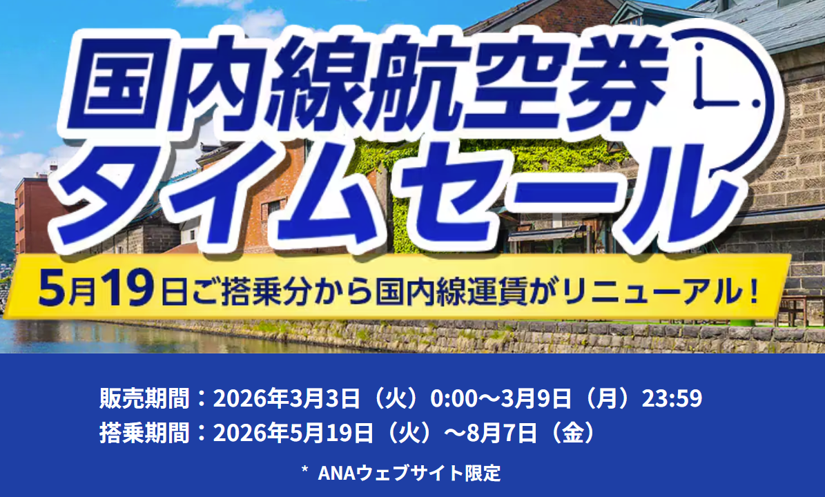 2026年3月3日(火)0:00~3月9日(月)23:59までANA国内航空券タイムセールが開催です! 最近のANAは2週間に1回ペースでセールをやっているような気がします。 国内線の採算がーとか報道 ...