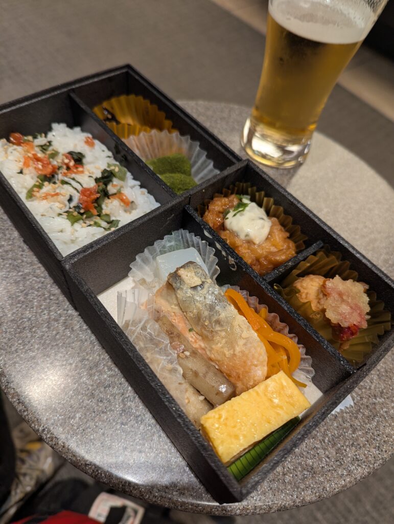 いつも早朝出発なので、空港で夕食をいただくのは稀ですが、この日は珍しく夜発の便なので、ラウンジでお弁当をいただくことにいたしました。