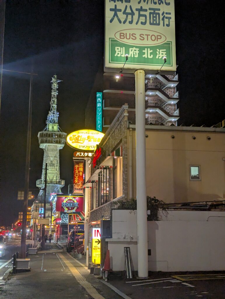 今回はレンタカーを使わずバス旅としていたので、最終バスで別府方面へ。