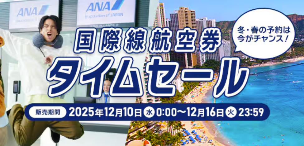 2025年12月10日(水)0:00~12月15日(月)23:59までANA国内航空券タイムセールが開催です!