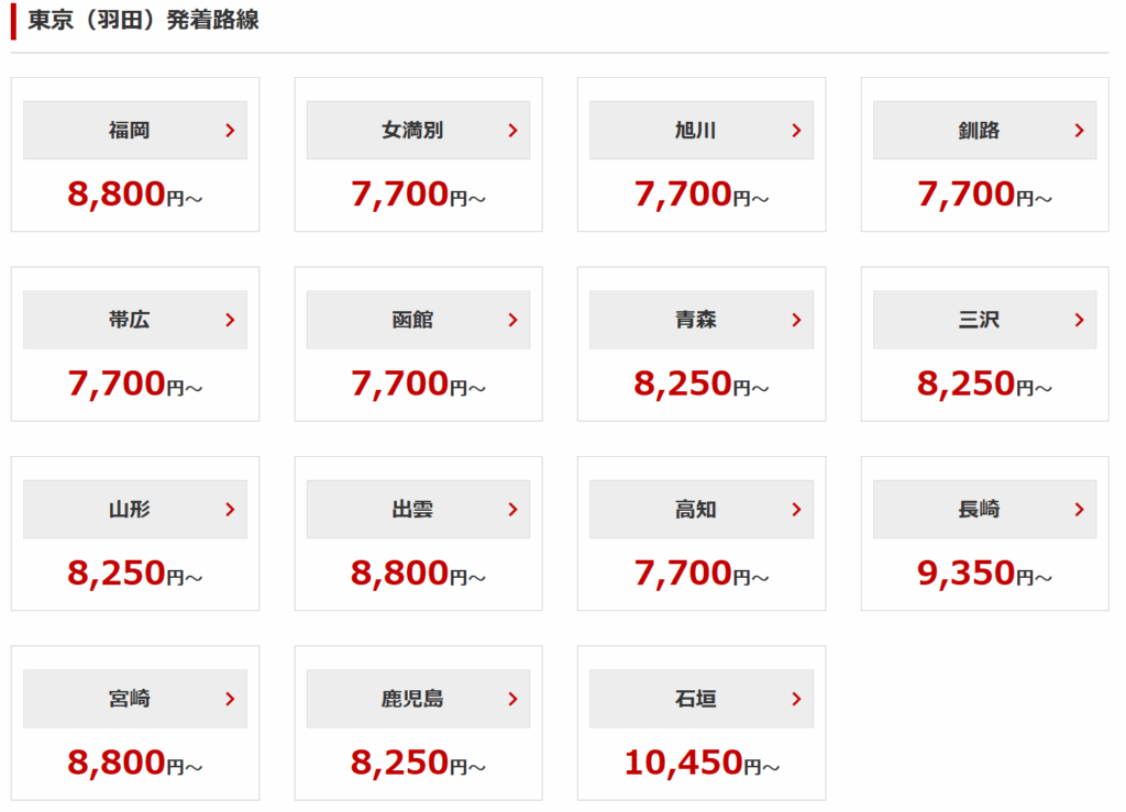 羽田⇔女満別、旭川、釧路、帯広、函館、高知 7,700円~